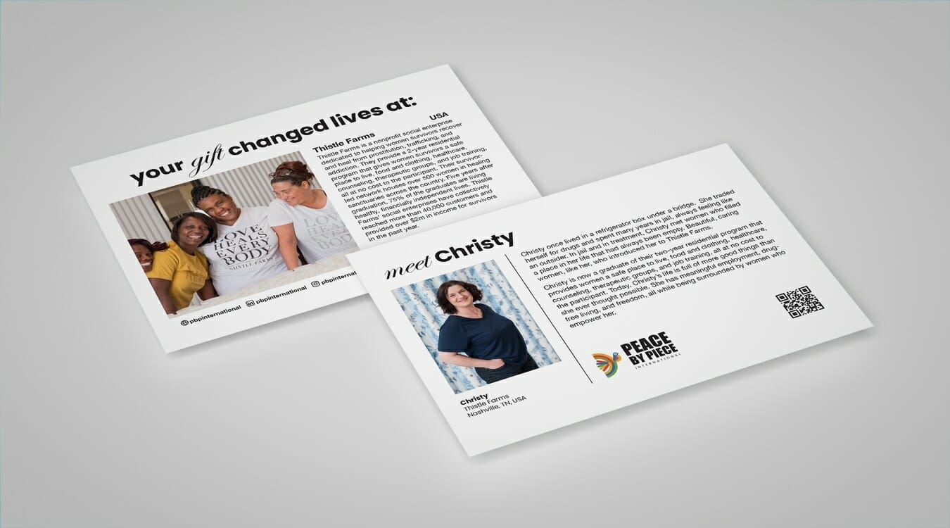 This Peace by Piece International partner, Thistle Farms, was founded in 1997 to help women survivors find physical and emotional healing through a free two-year, holistic program. Women receive trauma therapy, recovery support, community, and employment. Through its social enterprises—including a body and home product line and a café—Thistle Farms creates employment opportunities that support healing and financial independence. All proceeds are reinvested into its programs, fostering a community where women can rebuild their lives with dignity and purpose.
